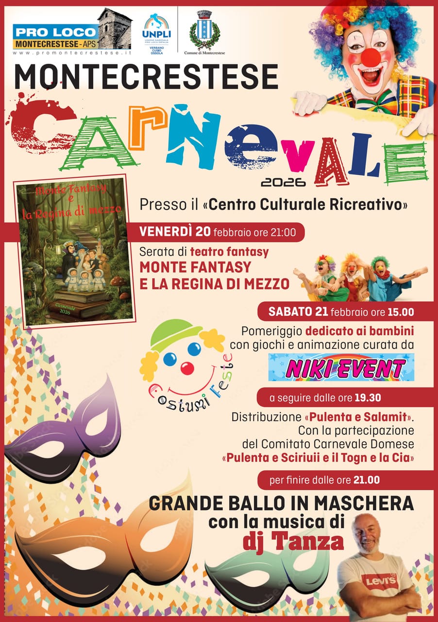 - 🎉🎭 CARNEVALE MONTECRESTESE 2026 🎭🎉Vi aspettiamo al Centro Culturale Ricreativo per due giorni di festa, spettacoli e divertimento per tutte le età! 📅 Venerdì 20 febbraio – ore 21.00✨ Serata di teatro fantasy🎬 Monte Fantasy e la Regina di Mezzo 📅 Sabato 21 febbraio👧🧒 Ore 15.00 Pomeriggio dedicato ai bambini con giochi e animazione a cura di Niki Event🍽 Dalle ore 19.30 Distribuzione di pulenta e salamit con la partecipazione del Comitato Carnevale Domese“Pulenta e Sciruiii e il Togn e la Cia”💃🕺 Dalle ore 21.00🎶 Grande ballo in maschera con la musica di DJ Tanza🎭🎉 Venite mascherati e pronti a divertirvi! Il Carnevale a Montecrestese vi aspetta! #Carnevale2026 #CarnevaleMontecrestese #ProLocoMontecrestese#FestaInMaschera #EventiInValle CarnevalePerTutti 🎉🎭
